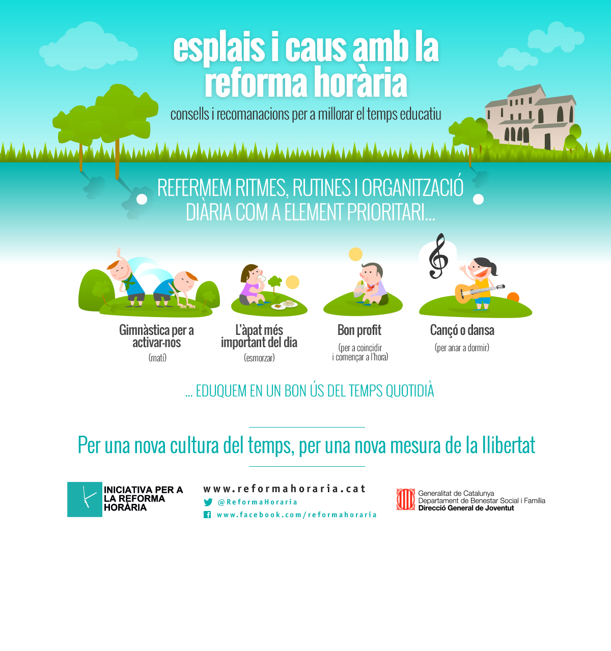 Des de la Generalitat de Catalunya s’ha impulsat un seguit de propostes de canvi per tal d’humanitzar els horaris existents per a la ciutadania. Aquestes mesures es van vertebrar amb la creació d’un Consell Assessor per a la Reforma Horària ja fa dos anys i amb la redacció d’un Pacte per a la Reforma Horària, al juliol d’aquest any.