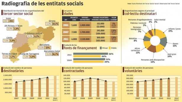 Observatori del Tercer Sector. El retrat correspon a dades del 2011 i, per tant, tot indica que a hores d'ara la cruesa de la crisi ha fet que hi hagi moltes més persones que depenen de les ONG socials. De totes maneres, l'Anuari és molt revelador de l'evolució del rol d'aquestes entitats: entre el 2007 i el 2011 van atendre 430.000 persones més, en van tancar 700 i en dos anys s'han perdut 18.000 llocs de treball.